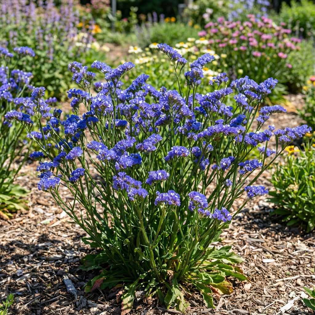 Nome Botanico: Limonium sinuatum Nome Comune: Statice, Lavanda di Mare Tipo di Pianta: Annuale Colore del Fiore: Blu intenso Periodo di Fioritura: Estate fino all’autunno Altezza: 30–60 cm (12–24 pollici) Esigenza di Luce: Sole pieno Tipo di Terreno: Sabbioso, ben drenato Irrigazione: Da bassa a moderata; resistente alla siccità Zone USDA: 3–10 Tempo di Germinazione: 10–14 giorni a 18–21°C (65–70°F)