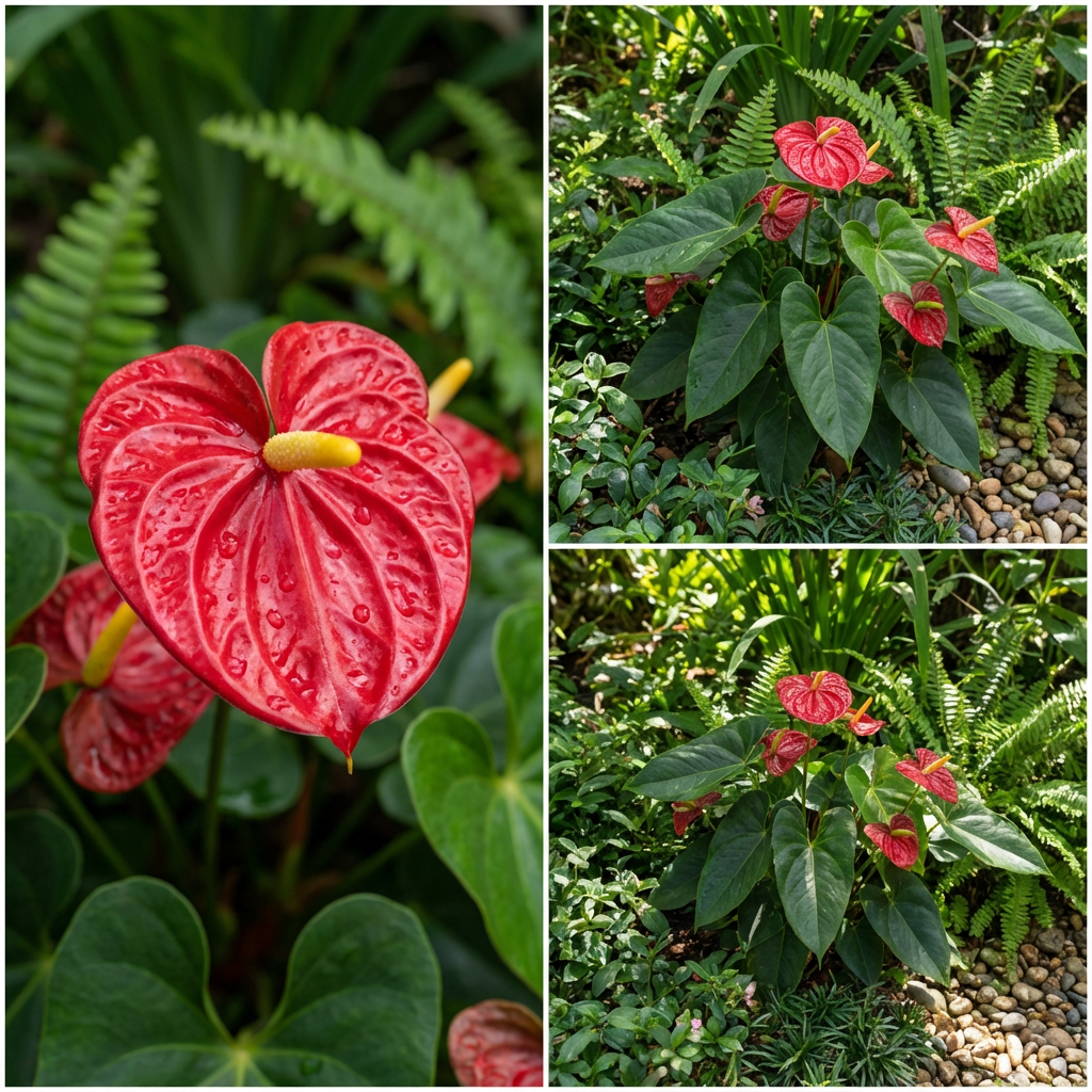 Produces glossy green leaves and vivid red spathes.
